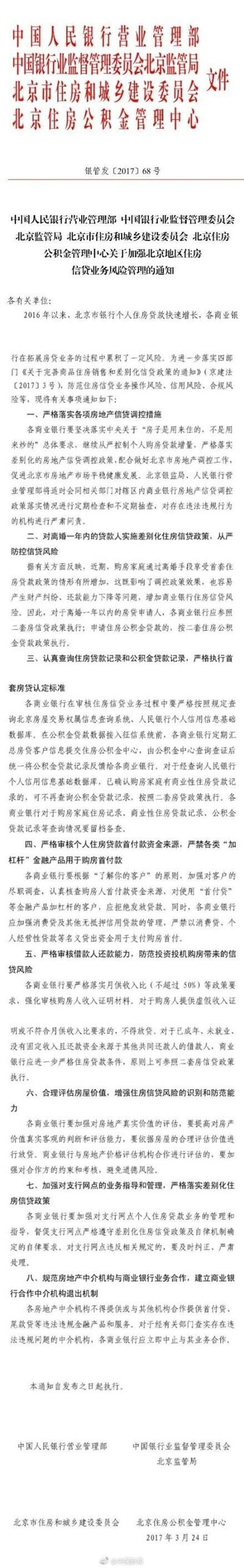 人民政法 讯 据人民网 中国人民银行网站今天发布《关于加强北京地区住房信贷业务风险管理的通知》,对北京地区离婚一年内的贷款人实施差别化住房信贷政策,严控信贷风险。离婚一年内的房贷申请人,各商业银行应参照二套房信贷政策执行。 通知指出,严格落实各项房地产信贷调控措施。各商业银行要坚决落实中央关于“房子是用来住的,不是用来炒的”总体要求,继续从严控制个人购房贷款增量,严格落实差别化的房地产信贷调控政策,配合做好北京市房地产调控工作,促进北京市房地产市场平稳健康发展。北京银监局、人民银行营业管理部将适时会同相关部门对辖区内商业银行房地产信贷调控政策落实情况进行定期检查和不定期抽查,对存在违法违规行为的机构进行严肃问责。 通知称,据有关方面反映,近期,购房家庭通过离婚手段享受首套住房贷款政策的情形有所增加,这既影响了调控政策效果,也容易产生财产纠纷、还款能力下降等问题,增加商业银行住房信贷风险。因此,对于离婚一年以内的房贷申请人,各商业银行应参照二套房信贷政策执行;申请住房公积金贷款的,按二套住房公积金贷款政策执行。